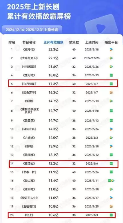 白鹿的扛剧能力非常强,前不久,最新统计2025年上新长剧累计有效播放霸屏榜,在2025年,白鹿有三部剧与观众见面,分别是:《白月梵星》《北上》《临江仙》,这三部剧的全部入榜,总播放量高达40亿+。