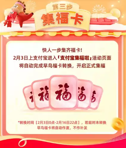 上支付宝搜索“集福啦”,参与“早鸟活动”抢早鸟稀有福卡,为马年开个好彩头!