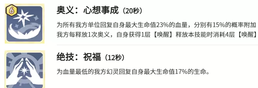 奥义技能“心愿天灯”拥有20秒冷却时间,能为我方单体回复最大生命值约23%的血量。每次释放奥义时,祈愿神灯都会获得一层“唤醒”效果。当累积4层“唤醒”后,便可再次释放奥义。这次释放的技能必定触发天赋效果,瞬间实现群体高额治疗以及双重增益,是扭转战局的关键。而冷却时间为12秒的绝技“精准聚焦”,则会为生命值最低的队友送去大约17%最大生命值的回复。