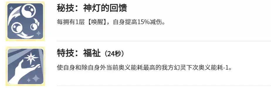 神灯的“灯灵反馈”技能,让角色在守护队友的同时,也能稳固自身。每拥有一层“唤醒”效果,就能获得15%的减伤。叠加起来的减伤效果,使他在激烈战斗中更不易倒下,从而保证持续的治疗输出。“福泽绵长”是一项冷却24秒的团队辅助特技,可以减少自身下一次奥义的能耗,也可以选择奥义能耗较高的队友为目标,降低其奥义消耗,帮助团队更快地积攒奥义,打出连锁爆发。“神格愿力护盾”则让治疗更具安全感,一旦将目标治疗至满血状态,便可额外获得自身15%最大生命值的护盾。