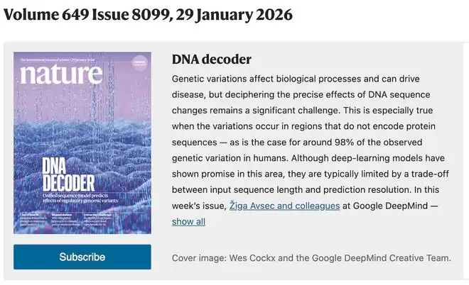 智东西1月29日报道,今日凌晨,2024年诺贝尔化学奖得主、谷歌DeepMind CEO Demis Hassabis带领团队研发的AI基因组模型——AlphaGenome,登上了顶级期刊Nature(自然)最新一期封面。这是继AlphaFold之后,DeepMind又一项重磅生命科学研究登上Nature。