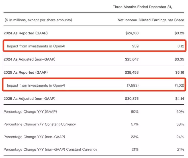 在净利润(GAAP)方面,受投资OpenAI收益等因素影响,其增长率飙升至60%,达到385亿美元。