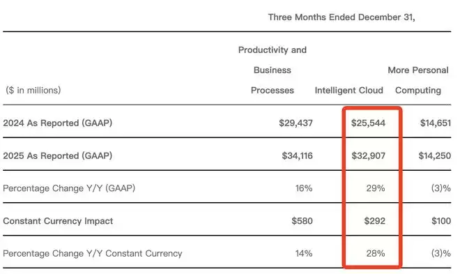 2025年全年,微软智能云业务收入达1205亿美元,相比2024年的1048亿美元同比增长15%。