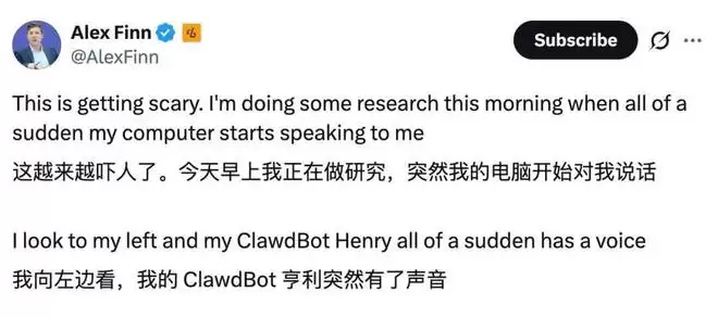 AI 创作平台的创始人 Alex Finn 就遇到了「开口说话」的 Clawdbot。