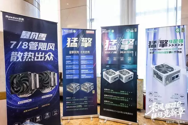 在盛典现场,航嘉重点展示了专为网咖电竞场景优化的高端硬件产品。猛犸系列电源凭借金牌高效架构与原生的PCIe5.1接口,能够稳定支撑高性能显卡的满功耗运行;而暴风雪系列散热器则采用多热管导热与智能温控技术,实现了高效静音的散热表现。