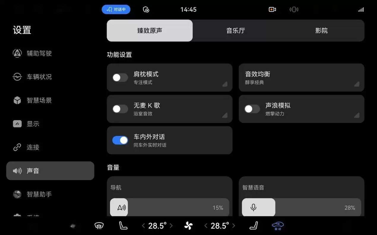 新增功能中,车内车外对话功能尤为引人注目。通过车外麦克风,用户无需打开车窗即可与车外附近人员进行双向对话。该功能可通过设置-声音-功能设置路径开启,同时支持方向盘自定义按键快捷操作,极大地便利了用户在不同场景下的使用需求。