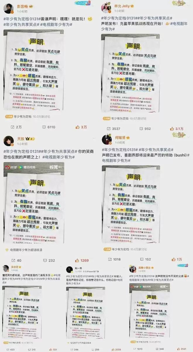 内娱剧宣总算整明白活了!1月29日《年少有为》官宣定档1月31日腾讯视频独播,刚过一小时主演团就集体发“抽象声明”炸翻全网。没有客套的定档祝福,全是“为笑点负责,为有聊负责”的搞笑承诺,男主彭昱畅一句“嘿嘿,就是玩!”直接点名该剧主题,网友直接笑疯,直呼这是内娱年度最懂打工人的剧宣操作。