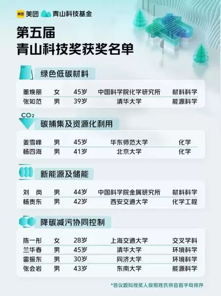 “青山科技奖”由美团于2024年发起设立,旨在鼓励更多科研力量投身环保研究,助力绿色、低碳、可持续发展基础科研及技术成果转化。至此,累计已有49名青年科学家获奖。