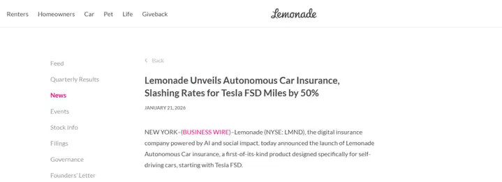 1月21日,Lemonade推出全球首款专为自动驾驶设计的车险产品:只要车主在行驶中启用特斯拉FSD(全自动驾驶)功能,该段里程的保费即可享受50%折扣。