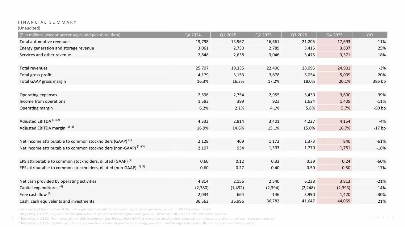 特斯拉最新披露的2025年财报,业绩表现堪称一场前所未有的震荡。全年总收入为948.27亿美元,相比上年下滑了3%,这是公司公开披露财务数据以来,首次出现年度营收同比负增长。净利润的表现则更为严峻,全年归属母公司净利润37.94亿美元,同比急剧减少46%;更令人关注的是第四季度,单季净利润仅录得8.40亿美元,同比大幅下降61%,创下同期历史新低记录。