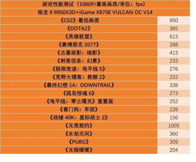 在玩家们最关注的游戏性能方面,我们挑选了十几款相对热门的网游和3A游戏进行测试。七彩虹X870E火神加上锐龙9 9950X3D和RTX 5090 D的组合,可以带来极为流畅的画面表现,在《无畏契约》这种FPS游戏中更是可以达到千帧水平,将游戏体验推上了新高度。此外,七彩虹X870E火神在搭配X3D处理器时,还可以在BIOS中打开X3D Game Mode选项,可以进一步提升锐龙9 9950X3D这种双CCD的X3D处理器在部分游戏中的性能。
