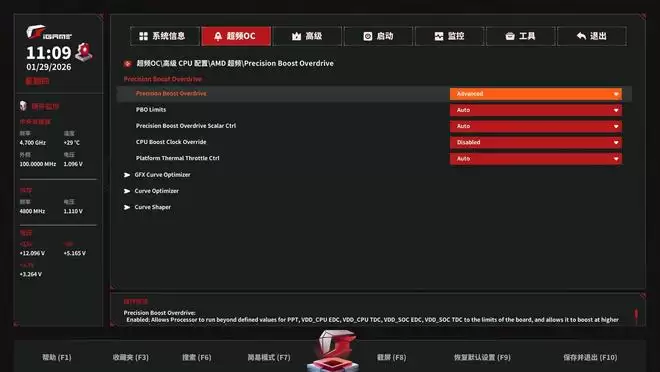 超频设置界面也很清爽,可以设置处理器倍频,处理器电压等。其他的功能,比如PBO 2调节、Curve负压调节、X3D Game Mode设置等功能,七彩虹X870E火神的BIOS中一应俱全,调节选项丰富而直观,很方便玩家进行超频操作。
