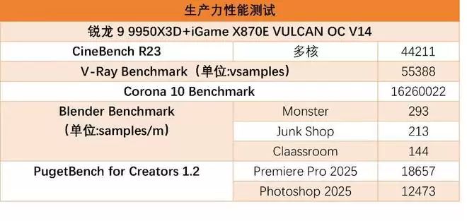 处理器生产力性能测试中,七彩虹X870E火神搭配锐龙9 9950X3D处理器在Cinebench R23中的跑分达到了44211。而在考验多线程性能的3D渲染软件中,也获得了出色的成绩。七彩虹X870E火神豪华的供电、散热配置,可以充分发挥锐龙9 9950X3D这种旗舰处理器的性能。