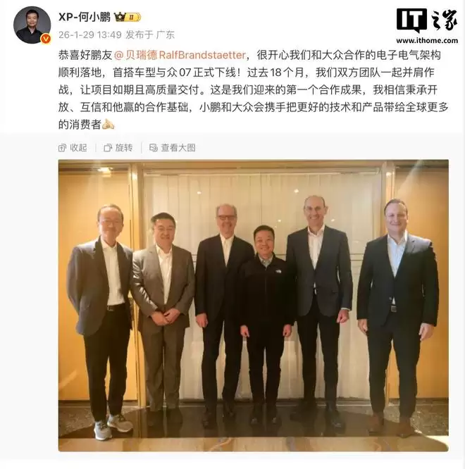 1月29日,据IT之家消息,小鹏汽车董事长何小鹏当天下午发文宣布:“我们与大众汽车合作的电子电气架构已成功落地,首款车型与大众07正式下线!过去18个月里,双方团队紧密协作,确保项目如期高质量交付。这是我们合作的首个成果,相信秉持开放、互信、共赢的合作理念,小鹏与大众将持续携手,把更先进的技术和产品带给全球消费者。”