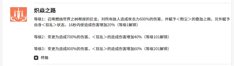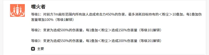 其实妮娅一般情况下第一个会使用的技能叫做“噬火者”。这个技能可以让她带来一个扇形范围的输出,并且根据她目前站位找到前方7米左右的区域范围,对其中的敌人造成40%的伤害之后,她可以消耗掉身上持有的粉尘效果。一般情况下这里如果达到四层的话,每一层噬火者为她带来的伤害量提升都达到了100%的数值。后期如果想要升级的话,技能升级对于她攻击力带来的改变,体现在550%的伤害量提升效果上面。