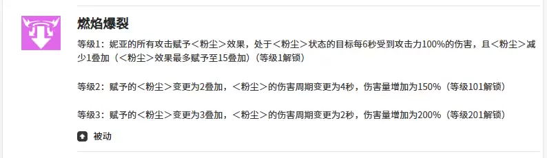另外她的第四个技能是火焰爆裂,这个技能对于你来说其实就是打基础带来各种状态加成的一个技能,前期收到的粉尘状态基本也是靠这个技能来施加的。只要是处于粉尘状态当中的敌人,那么在其中每秒都会受到妮娅在攻击力上100%的伤害,且这里粉尘的层数叠加。当中如果减少一层的话,后期大家也可以快速低叠加起来,一般在叠加层数上面,一个角色最多是可以叠到4-5层的粉尘能力的,所以大家如果要玩好妮娅自身的各种技能距离粉尘的状态,一定要学会施加这个状态哦。
