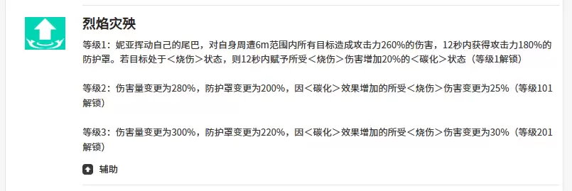 而第二个技能效果叫做“烈焰灾殃”,这个技能对于妮娅来说一般情况下使用的情景会比其他的两个技能范围要小一些。这里只能根据她周围6米范围当中的敌人来进行输出,这里输出的时候造成的伤害只有260%的伤害,但是在后续的12秒时间之内,她都可以获取180%的防御护盾能力。这里的防护罩如果给她带来防护的话,其实坚持的时间还是比较久的,而且在他给敌人输出的时候选中的这个目标,如果有烧伤状态影响的话,那么妮娅在这里还有12秒的时间可以继续给对面施加足够的烧伤,在伤害效果上面会增加20%的碳化状态,这样进行输出的话,敌人受到的持续伤害能力也会更多一些。