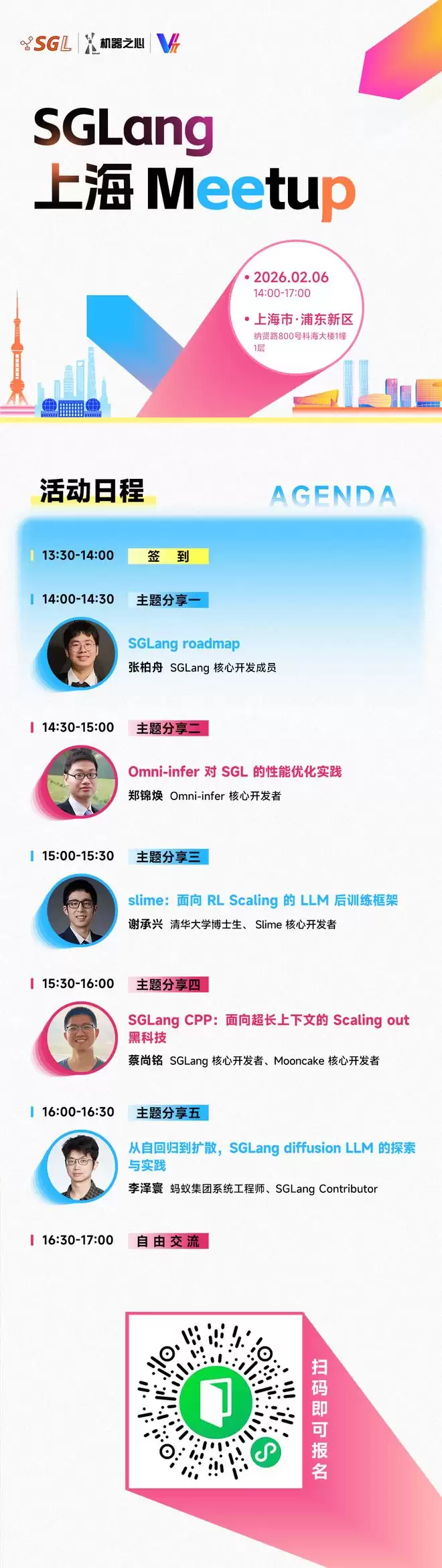 因此,由SGLang社区、机器之心、张江孵化器联合举办的线下Meetup,将让屏幕前的贡献者走向台前,请幕后的优化者分享独家心得。2月6日下午,“SGLang上海Meetup”将在上海浦东·纳贤路800号1层正式举行。