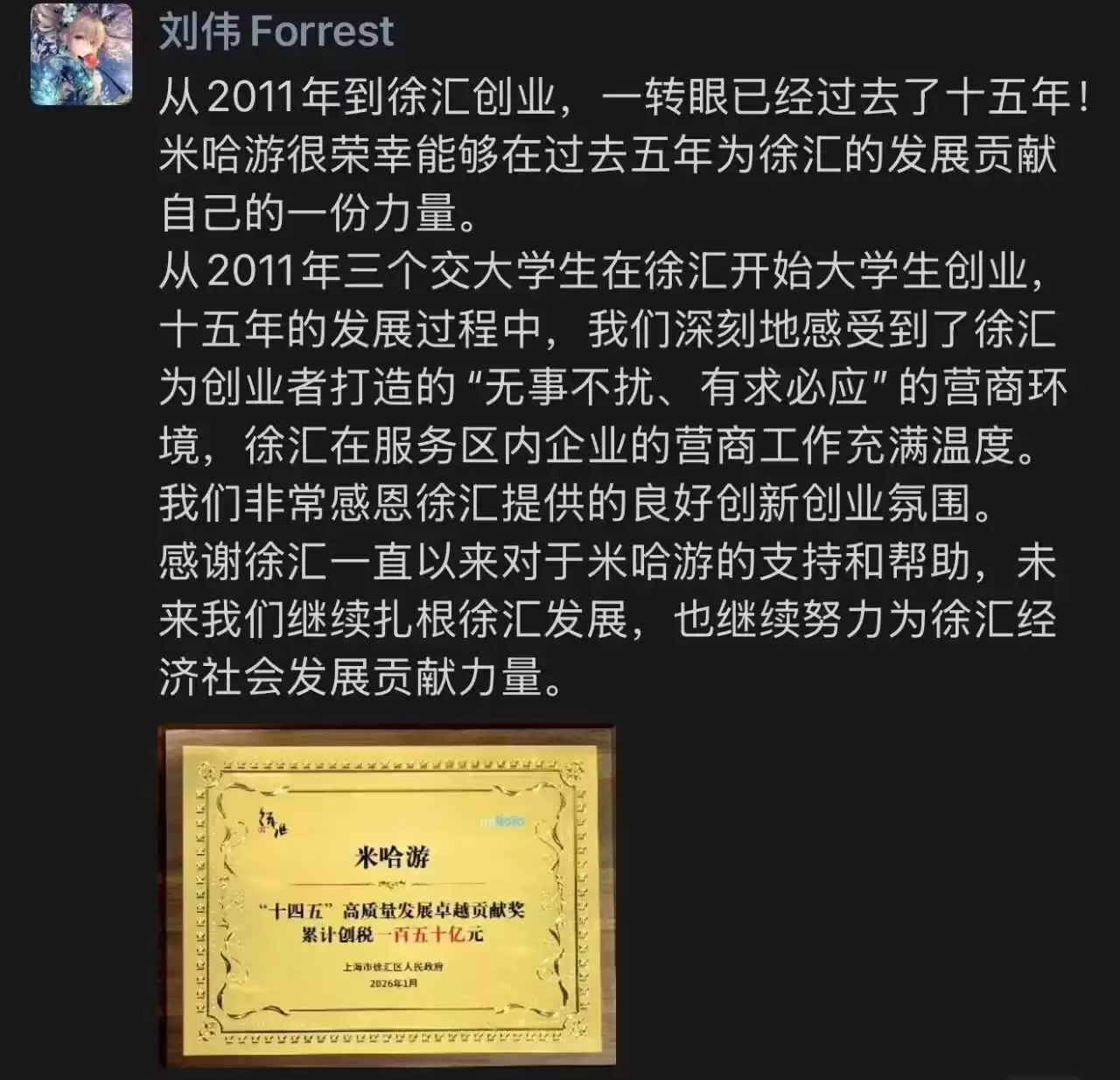 1月29日消息,行业信息显示,米哈游联合创始人刘伟近日在社交平台发文,透露公司已获得上海市徐汇区政府颁发的“十四五”高质量发展卓越贡献奖。