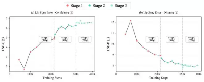 最后的 Stage 3 才真正把分辨率拉到 720p,这一步更像是「高清重制」。此时模型已经具备稳定的跨模态对齐能力,所以可以安全地把算力用在更高分辨率和更细致的空间建模上,而不会破坏之前学到的嘴型同步结构。为了应对高分辨率带来的显存和收敛速度变化,引入了更细粒度的 checkpoint 和更激进的并行优化策略。从曲线看,这一阶段 LSE-D 进一步压低并趋于平台,LSE-C 稳定在较高水平,说明性能已经进入收敛区间,更多是在做质量的精修。