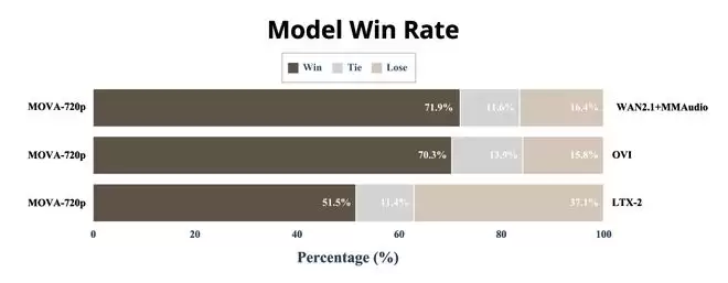 考虑到当前音视频生成模型的客观评价体系仍不够完善,MOVA 引入了竞技场(Arena)人为主观评测范式,包含了全球最新的开源音视频生成模型,累计获得 5000 次有效投票并对结果进行了系统统计。评测结果显示,MOVA 生成内容在整体偏好上保持领先:其在对战中更频繁获得用户选择,ELO 评分达到了 1113.8(初始分 1000),显著高于各基线模型;并稳定保持超过 50% 的胜率,其中面对 OVI 和级联系统(WAN+MMAudio)的胜率更是超过了 70%。