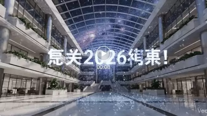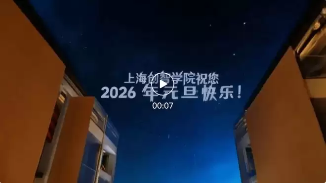 提示词:画面开始于创智学院宽敞而对称的中庭,日光透过透明的玻璃天窗洒落下来。镜头沿着中轴线缓缓向前移动,空间逐渐发生变化,光线化作细小的粒子向上飘散,空中浮现出若隐若现的数据流与抽象的智慧图形。天窗之外的天空逐渐转化为深邃的星空,仿佛整座建筑与宇宙连通。随着镜头推进,玻璃与植物微微发光,整个大厅呈现出安静而充满想象力的未来氛围。画面接近尾声时,所有光芒在中央汇聚,形成闪耀着星光的文字:“上海创智学院祝您 2026 年元旦快乐!” 神秘而震撼的电子配乐始终伴随画面,在文字出现时略微收束。