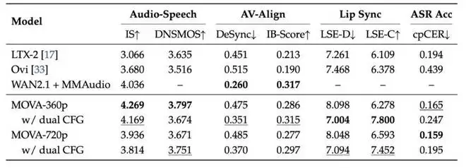 在 Verse-Bench 上的视听生成性能的量化比较。Audio 和 AV-Align 指标是在所有子集上进行评估的;Lip Sync 和 Speech 指标是在 Verse-Bench set3 上进行评估的;ASR Acc 是在团队提出的多说话人子集上进行评估的。加粗和下划线的数值分别表示最佳和第二佳结果。
