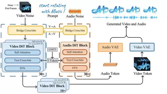 在这两座「塔」之间,团队引入了一个双向桥接模块(Bridge)。这个模块的存在,让视频与音频的隐藏状态在每一层都能进行深度的交叉注意力运算。这意味着画面在生成的每一瞬间,图像都在感知声音的节奏,而音频也在捕捉画面的光影。