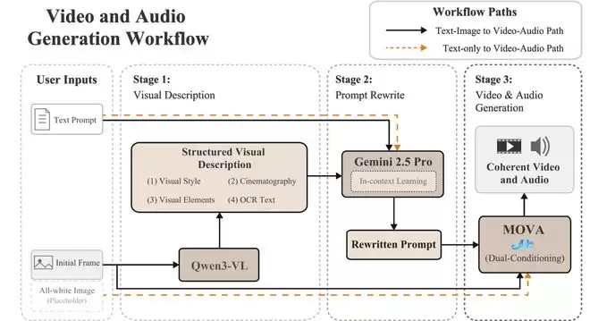 视觉解析:系统首先通过 Qwen3-VL 对用户提供的初始图进行结构化解析,将画面的色彩基调、构图信息、核心主体与文字元素抽取为可执行的视觉约束。提示词重构:在视觉约束与用户原始指令共同输入下,借助通用 LLM(如 Gemini)进行上下文示例驱动的提示词重写,将需求转译为更贴近训练分布、具备动态叙事的生成提示词。双重条件生成:最后,MOVA 结合重写后的提示词和初始帧图像进行「双重条件生成」,使视频在产生运动与变化的同时,最大化保持首帧图的视觉风格与关键元素,并更好地对齐用户意图。