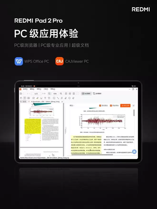 处理器方面,REDMI Pad 2 Pro搭载的是高通第四代骁龙7s,采用台积电4nm工艺制程,对比上代性能提升28%。强大的性能使Pad 2 Pro支持PC级WPS Office、PC级CAJViewer、PC级浏览器等专业应用,在平板上也能拥有PC级的专业体验。