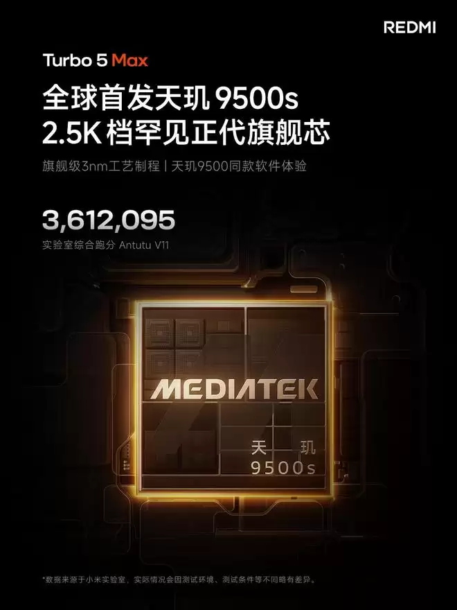 我们从核心配置开始聊起,REDMI Turbo 5 Max搭载了联发科旗下最新的天玑9500s处理器,其芯片架构与天玑9400+几乎一致,GPU方面以及缓存规格方面也十分相似,再搭配LPDDR5X Ultra和UFS 4.0的存储组合,放在这个价位妥妥的降维打击。