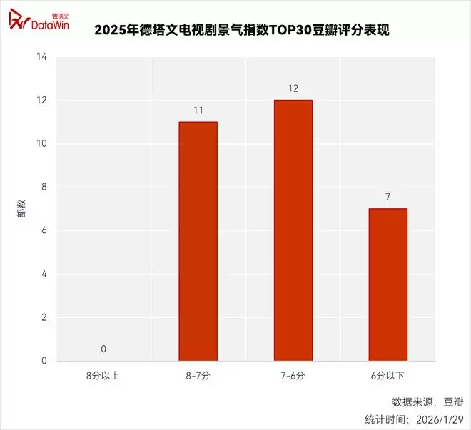 根据德塔文统计数据,2025年电视剧景气指数年榜中,景气指数排名Top30的剧集并未出现一部豆瓣8分的作品,豆瓣7分以上的作品共11部,豆瓣6分以下的作品共7部。