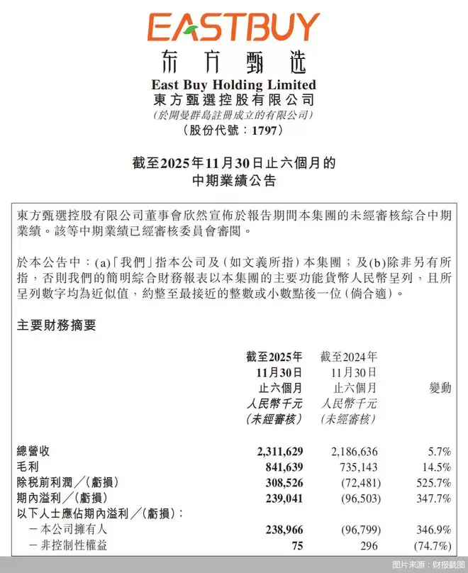 东方甄选2026财年中期财报显示,公司总营收为23亿元,同比增长5.7%。其中,来自App的营收从上年同期的5亿元增长至6亿元。若剔除2025财年上半年分拆前与辉同行直播间产生的部分收入,东方甄选总营收同比增加17%。
