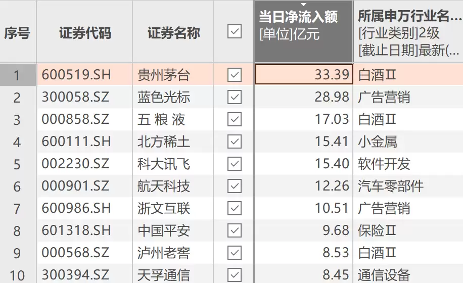 从行业分布来看,资金净流入前十的个股覆盖了多个领域。除上述两家白酒企业外,稀土行业龙头北方稀土、人工智能领域代表企业科大讯飞、保险行业巨头中国平安均榜上有名。数字营销领域的蓝色光标、航天科技领域的航天科技、互联网传媒领域的浙文互联,以及通信设备制造商天孚通信和白酒企业泸州老窖也跻身前十。