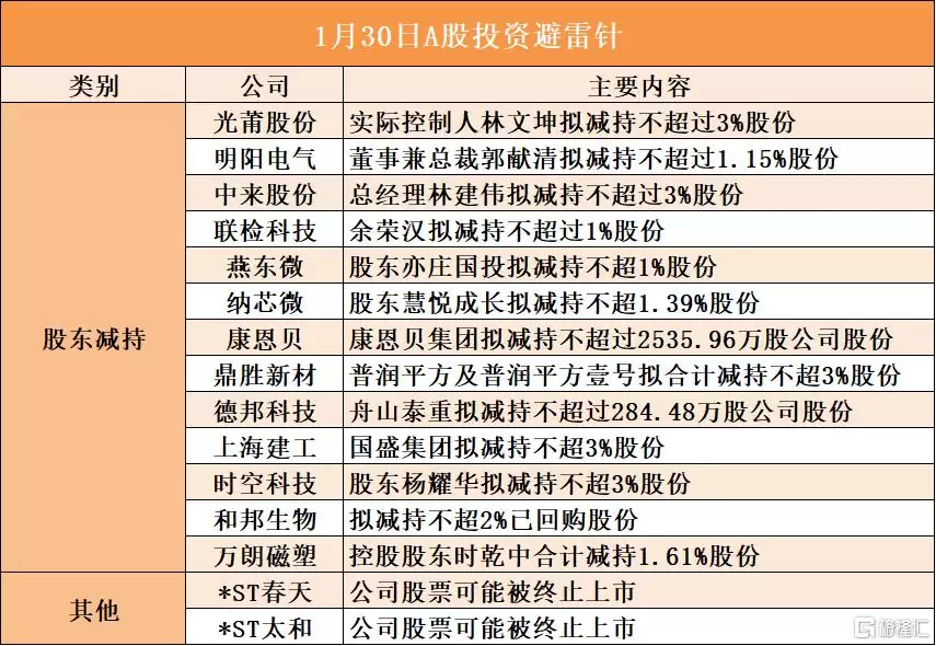 光莆股份实际控制人林文坤计划减持不超过3%的公司股份;明阳电气董事兼总裁郭献清拟减持不超过1.15%的股份;中来股份总经理林建伟计划减持不超过3%的股份;联测科技股东余荣汉拟减持不超过1%的股份;燕东微股东亦庄国投计划减持不超过1%的股份;纳芯微股东慧悦成长拟减持不超过1.39%的股份;康恩贝股东康恩贝集团计划减持不超过2535.96万股公司股份;鼎胜新材股东普润平方及普润平方壹号拟合计减持不超过3%的股份;德邦科技股东舟山泰重拟减持不超过284.48万股公司股份;上海建工股东国盛集团计划减持不超过3%的股份;时空科技股东杨耀华拟减持不超过3%的股份;*ST春天公司股票可能被终止上市;*ST太和公司股票可能被终止上市。
