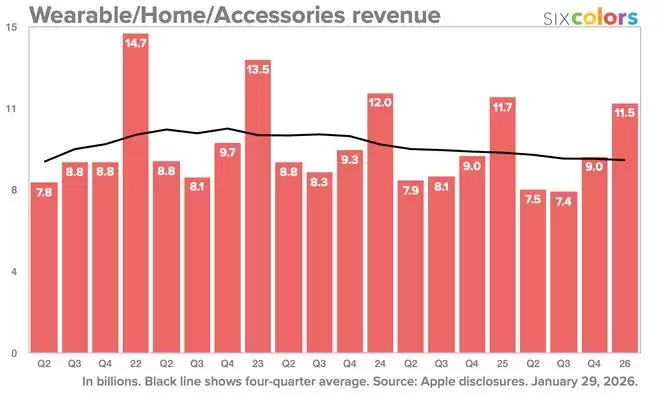 财报数据显示,包含AirPods、Apple Watch及HomePod等产品在内的“可穿戴设备、家居及配件”业务类别,本季度营收同比出现约2%的下滑。相关统计图表如下所示:
