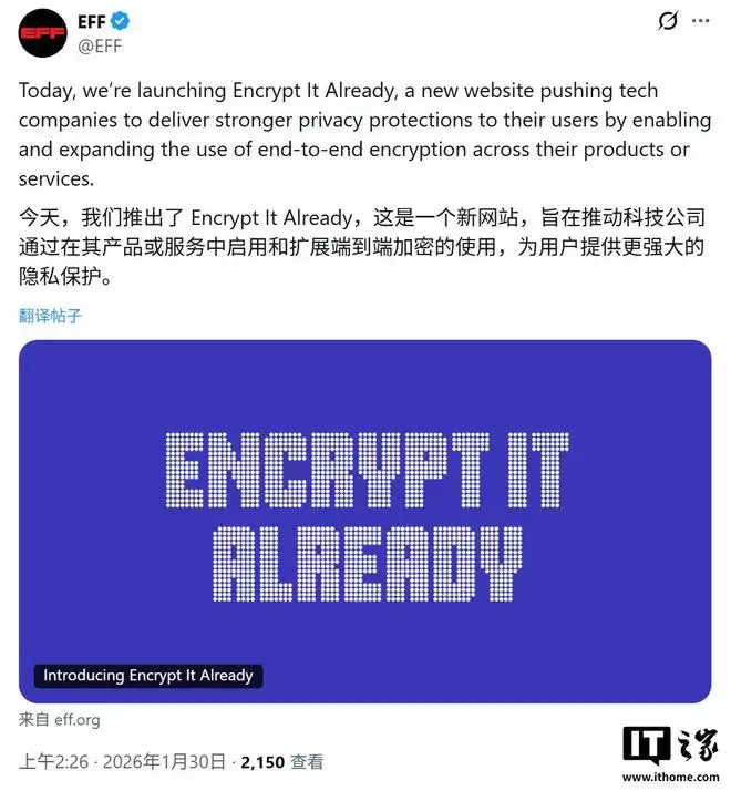IT之家1月30日消息,电子前哨基金会(EFF)今日正式发起“即刻加密”(Encrypt It Already)行动,向苹果、谷歌及Meta等科技巨头施压,要求其在全平台范围内落实或扩展端到端加密技术。