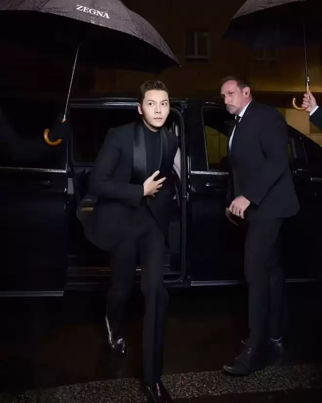 秀场的喧嚣还未褪尽,“好命哥”已换上一身红毯高级礼服,步入了夜色。镜头悄然捕捉的瞬间,他正从车内探身而出,肩线笔挺,步履生风,仿佛将刚才 T 台上的光芒也一同披在了身上。没有片刻停驻,奔赴下一场目的地。