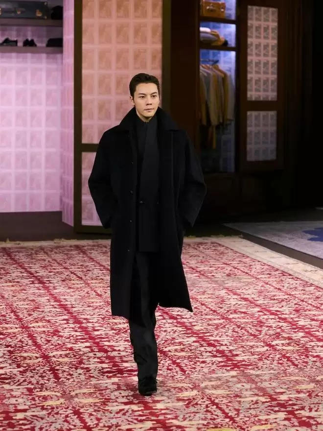 杰尼亚 2026 冬季系列以“家的衣橱”为主题,恰好与沈氏父子的家族羁绊形成深度共鸣。该系列从杰尼亚家族的真实衣橱汲取灵感诠释“衣物即家族记忆”的理念。在灯光下呈现出温润的质感,低饱和的大地色、矿物色调,恰是沈氏父子日常穿搭的延伸,既符合老钱风的克制美学,又凸显对“长期主义”的坚守。这与《许我耀眼》中沈氏父子的默契传承,形成了剧情与现实的双向呼应。
