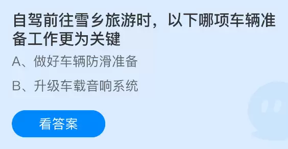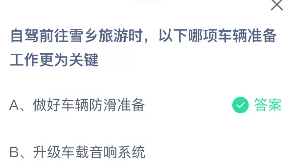 计划自驾前往雪乡游玩时,哪一项车辆准备工作更为关键?支付宝小鸡课堂开课啦!每天花一分钟参与答题赚饲料,喂养小鸡就能奉献爱心!轻松又有意义!2026年1月30日蚂蚁庄园的小鸡课堂题目正确答案是【做好车辆防滑准备】,自驾前往雪乡旅游时,做好车辆防滑准备工作更为关键。