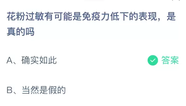 花粉过敏可能是免疫力下降的信号,这种说法是真的吗?支付宝小鸡课堂开课啦!每天只需花上一分钟答题赚饲料,喂喂小鸡就能贡献爱心,轻松又充满意义!2026年1月30日蚂蚁庄园的小鸡课堂题目正确答案是【确实如此】,花粉过敏确实有可能是免疫力低下的表现。