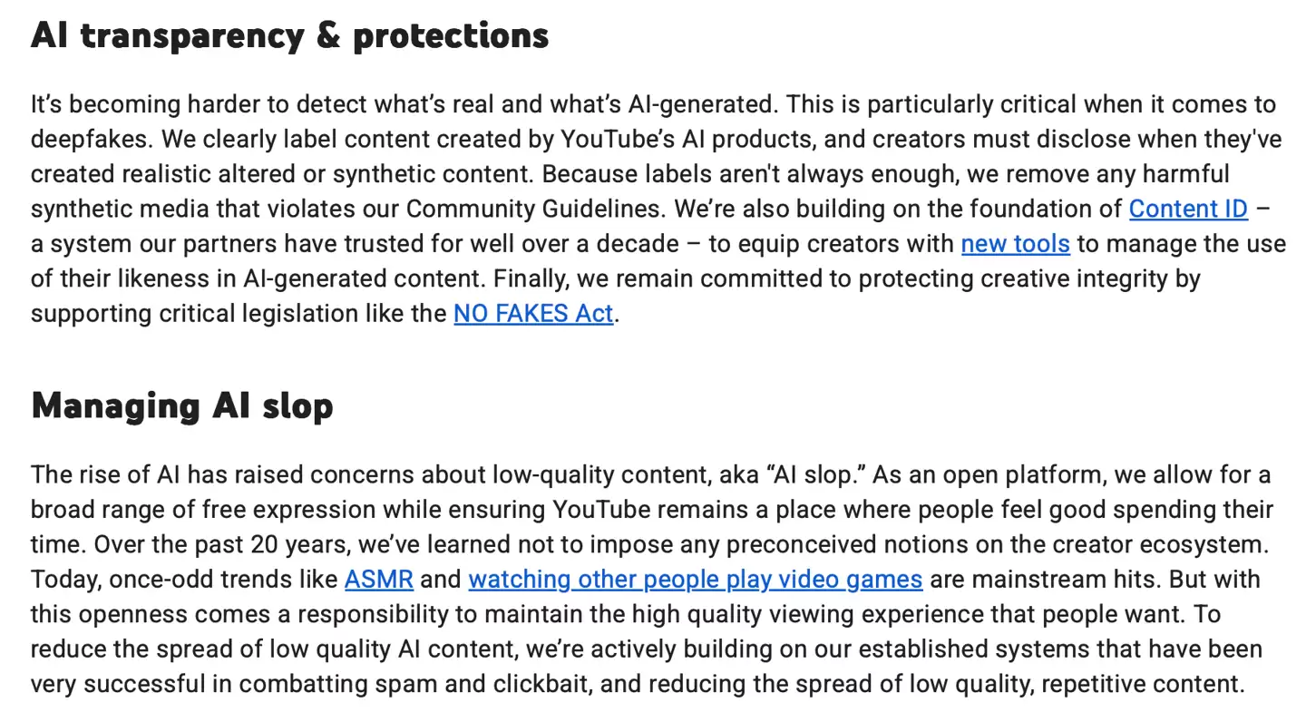 尼尔·莫汉同时指出,平台正在其原有的反垃圾和标题党系统基础上,积极构建新机制,以减少传播低质量、重复性AI内容。他强调,YouTube将移除任何违反社区规则的“有害合成媒体”,并为创作者提供识别和屏蔽深度伪造内容的工具。