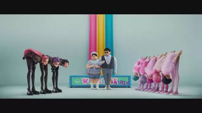 然而这般令人警醒的事实却并没有在《K-POP:猎魔女团》中得到呈现,影片里,女团Huntr/x的成员拥有绝对的话事权,她们没有身材焦虑,“自我管理”的唯一表现是演出开始前一刻还在摄取碳水和膨化制品;三人包办了作品的一切制作,能肆意把控行程安排,不经经纪团队允许就一键发布新作。相比之下,经纪人被塑造得像个随叫随到的喽啰,连同站在他身后那个更加权威的力量一并消失不见了。而在遍布全片的男女团交锋戏码之中,则充斥着浪漫情结和无害竞技,全然不顾K-POP行业无法被略开不谈的性别歧视。