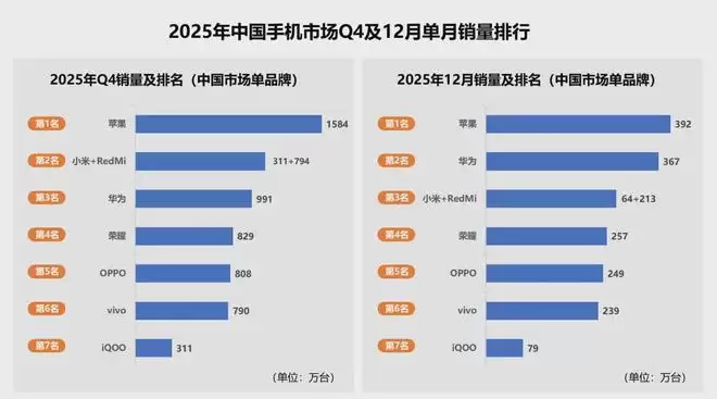 若拆分单品牌维度进行统计(即剔除子品牌影响,如将小米与Redmi、OPPO与一加分开看),有一家厂商的表现尤为突出:数据显示,荣耀在Q4单季度销量达829万台,12月单月销量为257万台。在单品牌维度下,无论Q4还是12月,荣耀的销量已紧随苹果和华为之后,稳居前三。