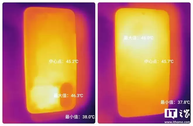 如图所示,30 分钟后,Turbo 5 Max 机身正面最高温达到了 46℃ 以上,背面最高温同样也在 46℃ 以上。