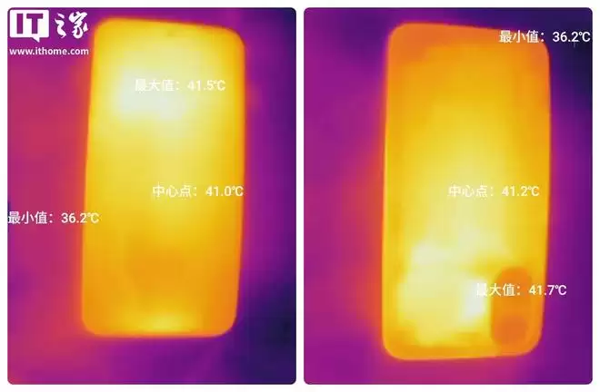 机身背部温度最高为 41.5℃,全新的 3D 循环冷泵确实发挥了作用,热量并没有在某一点堆积,而是均匀地散发到了机身背部。