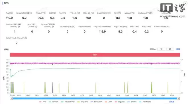 平均帧率 119.9FPS,帧率曲线平直如尺。
