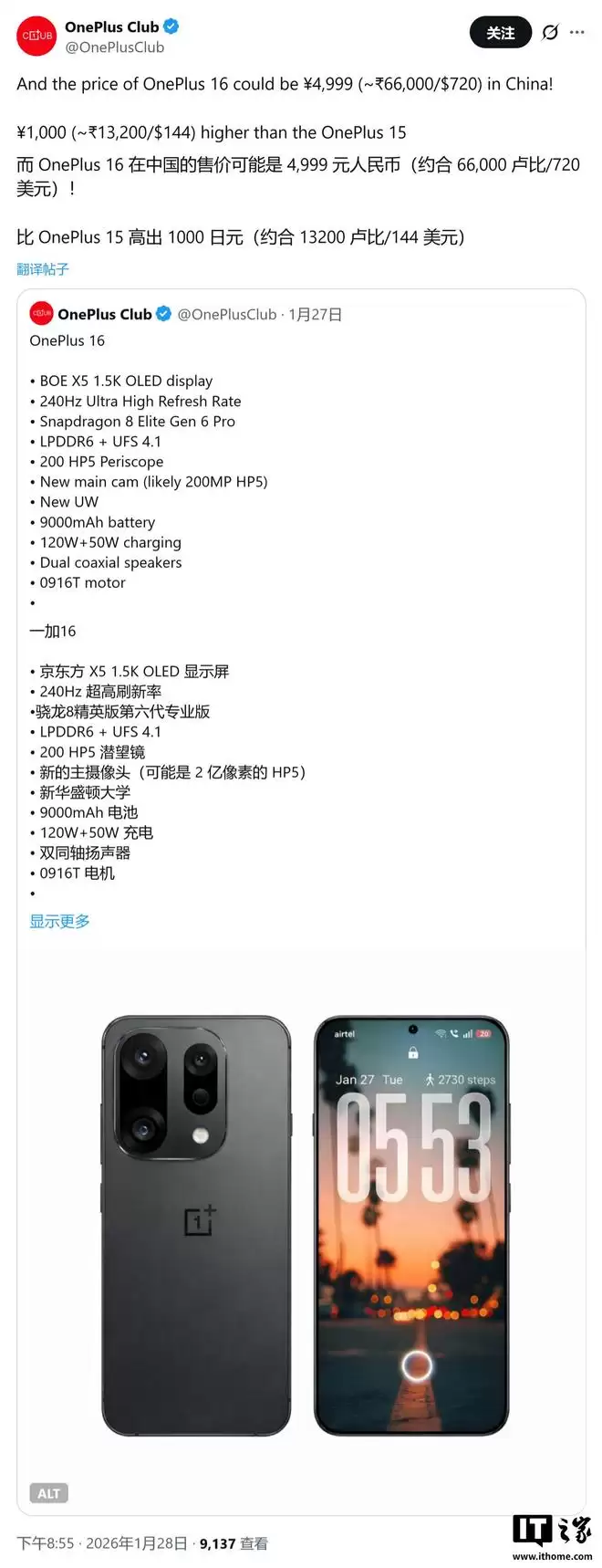 IT之家 1月30日消息,根据消息源 @OnePlusClub 在1月27日于X平台的爆料,一加16手机的核心规格与售价等信息已经浮出水面。消息预估这款新机或将在2026年第四季度正式亮相。