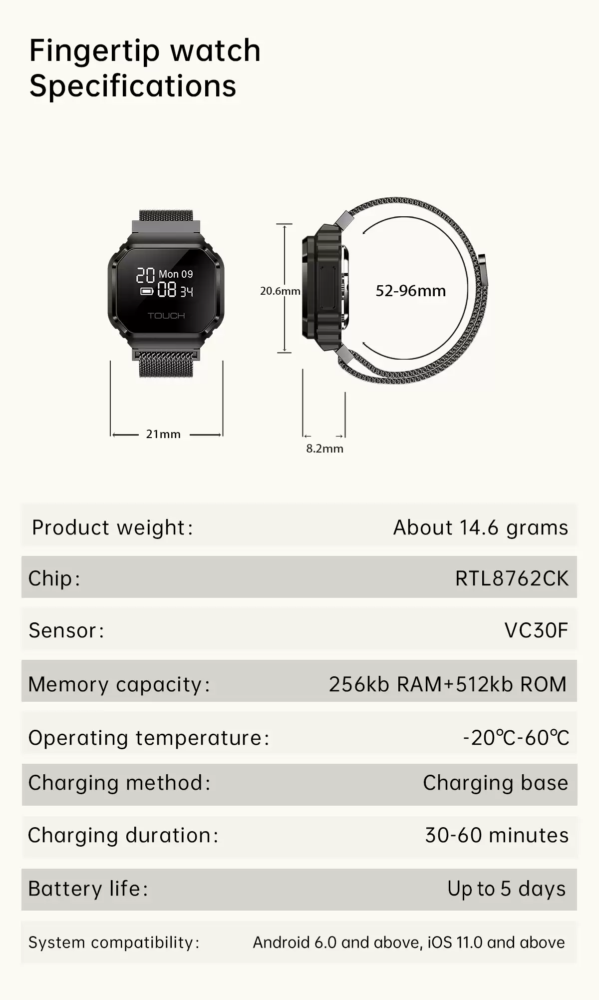 Rogbid Fusion以其精巧外观和齐全功能为特色,尺寸仅为20.6 x 21 x 8.2毫米,重量大约14克,整体设计与卡西欧的G-SHOCK戒指手表颇为相似。
