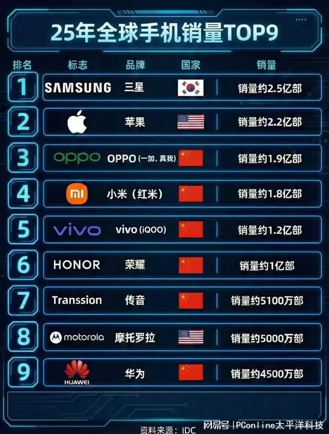 1月30日消息,国际数据研究机构IDC今日发布了2025年全球手机销量TOP9榜单。数据显示,OPPO凭借全年1.9亿部的出货量实现了强劲增长,成功跻身全球前三甲,成为了榜单中最引人注目的中国品牌。